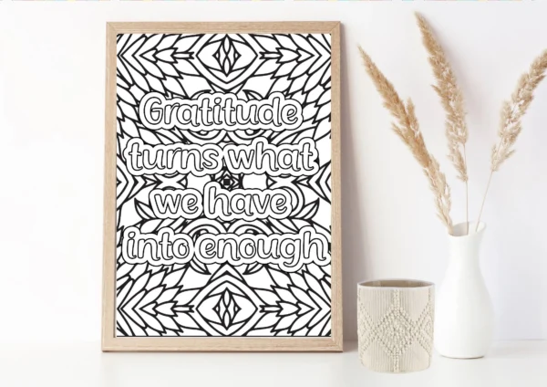 Each page features an inspiring quote about gratitude, beautifully integrated into original hand-drawn illustrations that are perfect for mindful coloring and emotional reset.